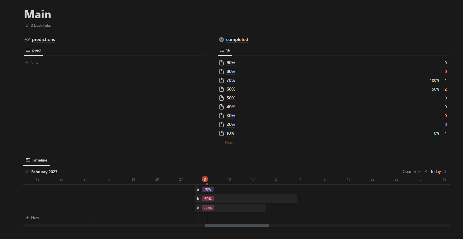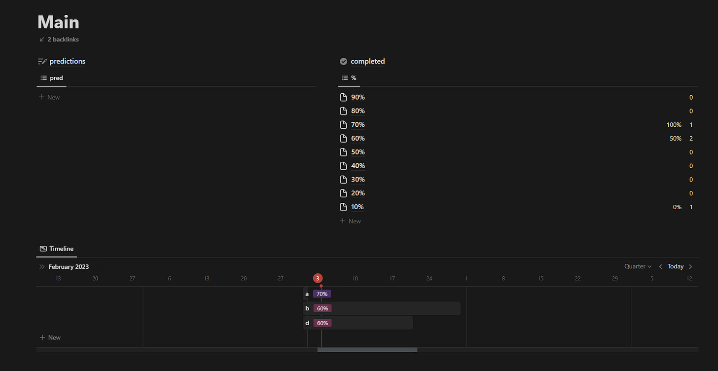 I'll share my Notion template in case someone wants to use it (If you don't care about using Notion specifically, Fatebook, Manifold, or other apps are probably a better tracking option).
